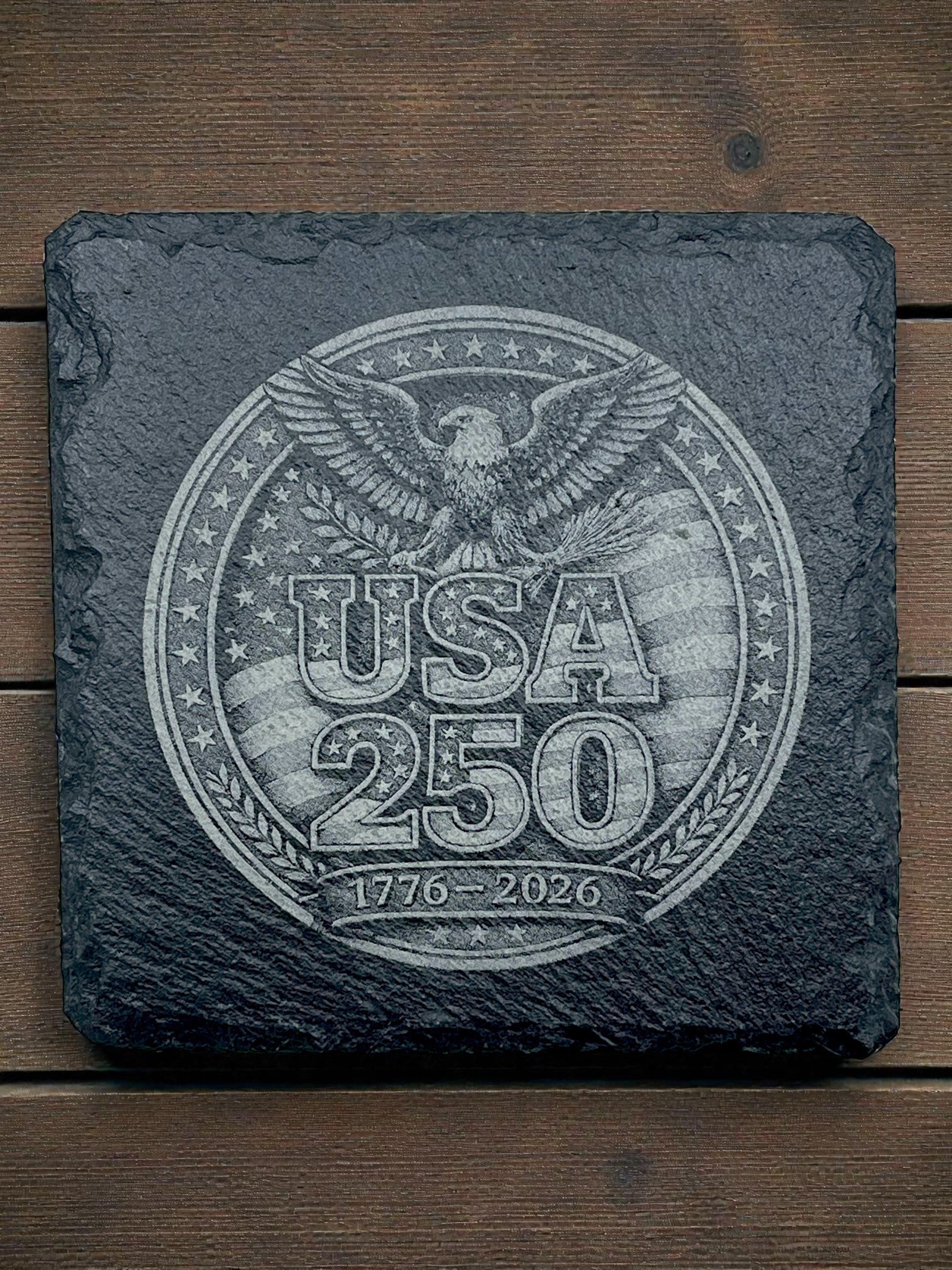 Commemorate America's milestone with these striking 4"x4" coasters that blend timeless design with modern craftsmanship. Choose either slate or ceramic coasters, adorned with vibrant UV-printed imagery or intricate laser-engraved details celebrating the United States' 250th anniversary. Perfect for protecting your surfaces while honoring this historic moment, these coasters make a meaningful addition to any patriotic collection or an unforgettable gift for history enthusiasts.